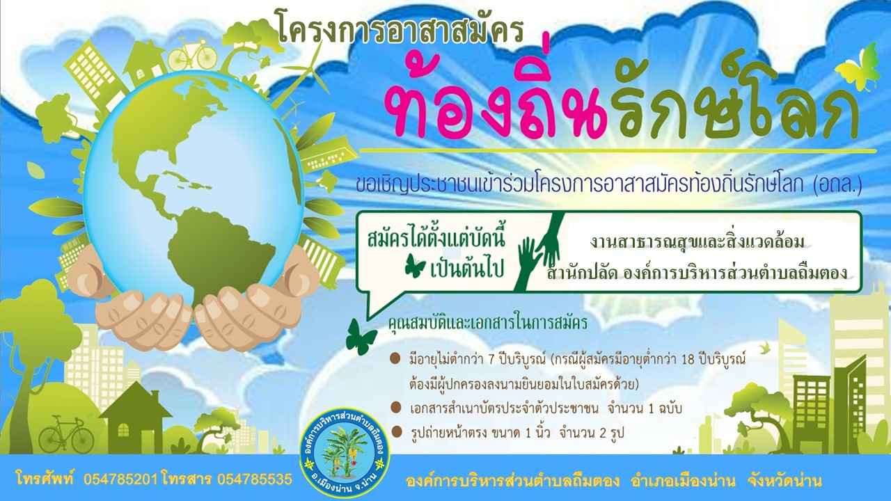 องค์การบริหารส่วนตำบลถืมตอง ขอเชิญชวนพี่น้องชาวตำบลถืมตอง สมัครเข้าร่วมโครงการอาสาสมัครท้องถิ่นรักษ์โลก